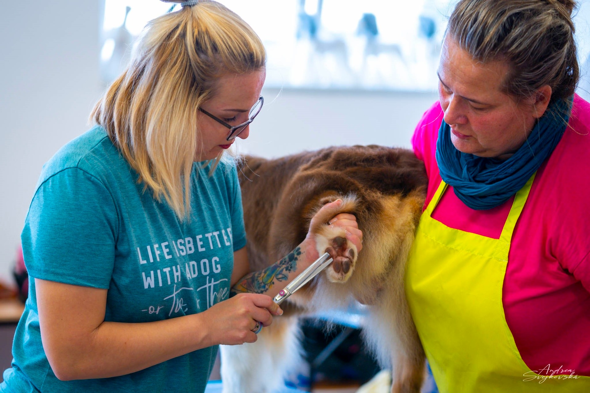 Tahle dvojka maká celý víkend na dvoudenním semináři úpravy australského ovčáka pod vedením Veroniky Stirčákové. Učí se triky, tipy i detaily, které dělají šampiony ještě krásnější.