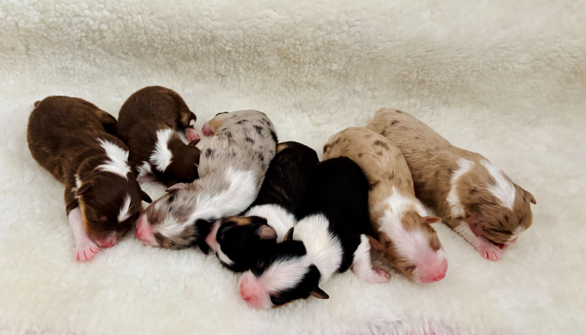 Rádi bychom vám představili naše malá chlupatá štěstí z prvního vrhu A – každé z nich je jedinečné a nese své první jméno i barevný podpis: